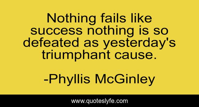 This page presents the quote "Nothing fails like success nothing is so defeated as yesterday's triumphant cause.". Author of this quote is Phyllis McGinley. .