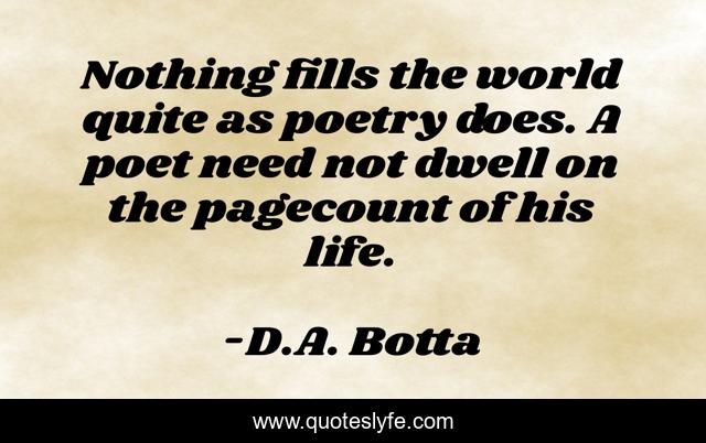 This page presents the quote "Nothing fills the world quite as poetry does. A poet need not dwell on the pagecount of his life.". Author of this quote is D.A. Botta. This quote is about poet, writer, writist, poetry,.
