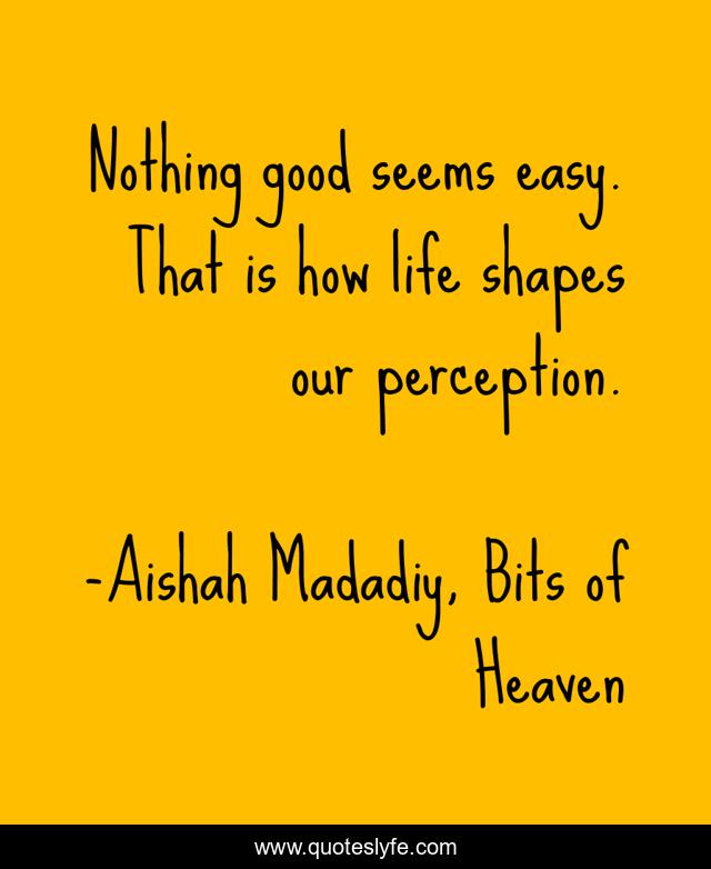 This page presents the quote "Nothing good seems easy. That is how life shapes our perception.". Author of this quote is Aishah Madadiy, Bits of Heaven. This quote is about life, good, values, easy,.
