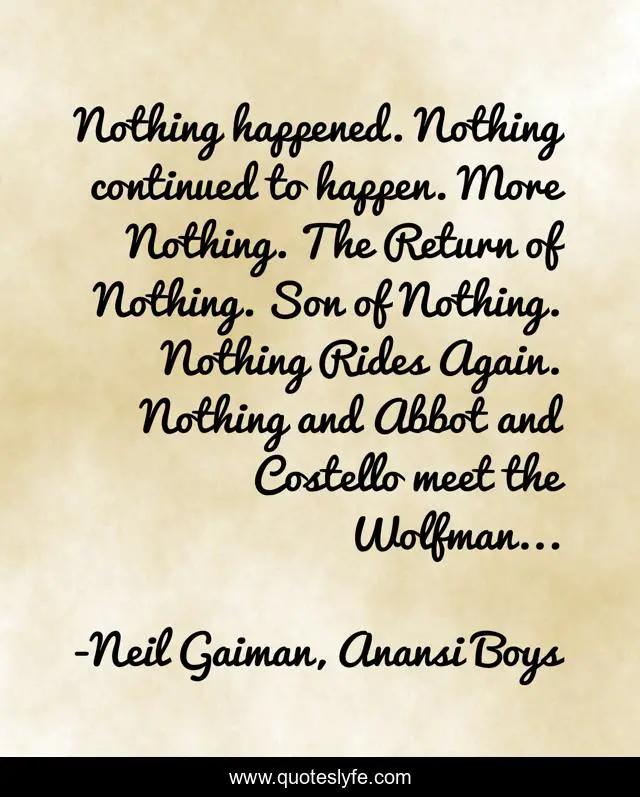 This page presents the quote "Nothing happened. Nothing continued to happen. More Nothing. The Return of Nothing. Son of Nothing. Nothing Rides Again. Nothing and Abbot and Costello meet the Wolfman...". Author of this quote is Neil Gaiman, Anansi Boys. This quote is about nothing, nothingness,.