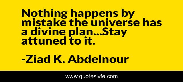 This page presents the quote "Nothing happens by mistake the universe has a divine plan...Stay attuned to it.". Author of this quote is Ziad K. Abdelnour. This quote is about universe, divine, mistake,.