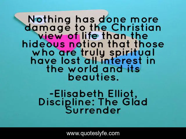 This page presents the quote "Nothing has done more damage to the Christian view of life than the hideous notion that those who are truly spiritual have lost all interest in the world and its beauties.". Author of this quote is Elisabeth Elliot, Discipline: The Glad Surrender. This quote is about discipline, beauty, holiness,.