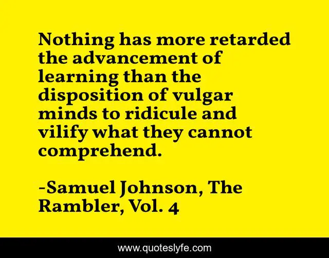 This page presents the quote "Nothing has more retarded the advancement of learning than the disposition of vulgar minds to ridicule and vilify what they cannot comprehend.". Author of this quote is Samuel Johnson, The Rambler, Vol. 4. This quote is about handicap, learning,.