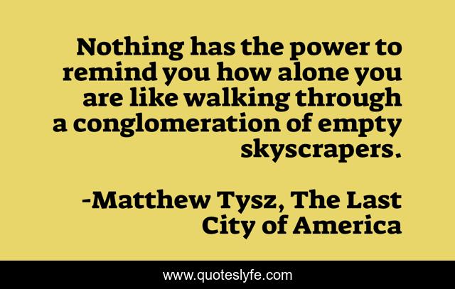 This page presents the quote "Nothing has the power to remind you how alone you are like walking through a conglomeration of empty skyscrapers.". Author of this quote is Matthew Tysz, The Last City of America. This quote is about loneliness, solitude, apocalypse,.