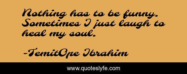 This page presents the quote "Nothing has to be funny. Sometimes I just laugh to heal my soul.". Author of this quote is TemitOpe Ibrahim. This quote is about inspirational, joy, choose-joy, laugh, enthusiasm, medicine-for-the-soul, happy, laughter, choose-laughter,.