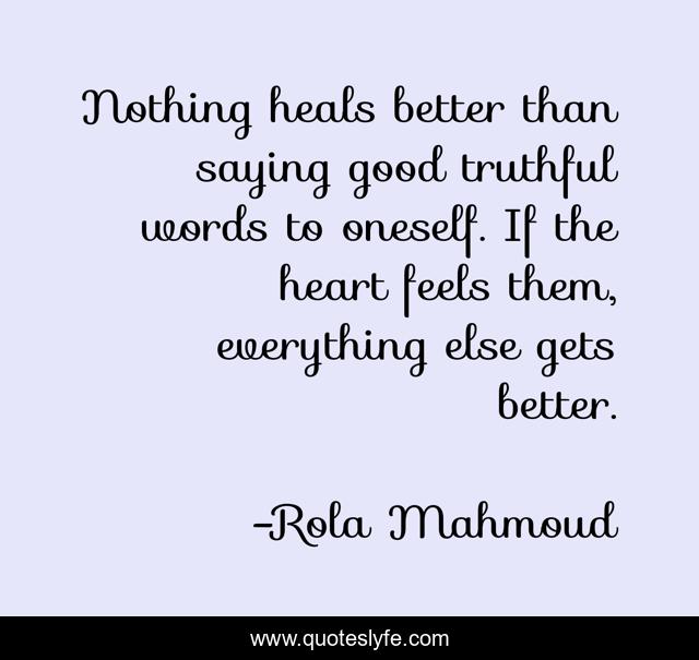 This page presents the quote "Nothing heals better than saying good truthful words to oneself. If the heart feels them, everything else gets better.". Author of this quote is Rola Mahmoud. This quote is about true, healing, rola-mahmoud,.