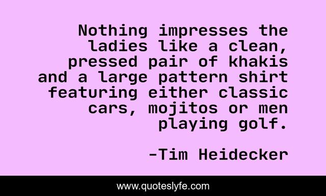 This page presents the quote "Nothing impresses the ladies like a clean, pressed pair of khakis and a large pattern shirt featuring either classic cars, mojitos or men playing golf.". Author of this quote is Tim Heidecker. This quote is about nothing, men, golf,.