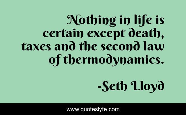 This page presents the quote "Nothing in life is certain except death, taxes and the second law of thermodynamics.". Author of this quote is Seth Lloyd. This quote is about nothing, life, law,.