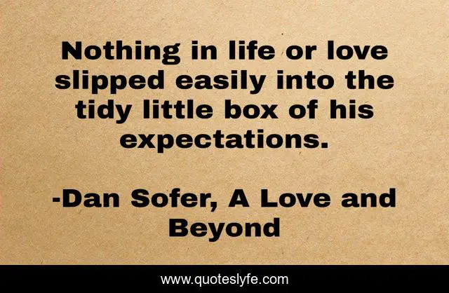 This page presents the quote "Nothing in life or love slipped easily into the tidy little box of his expectations.". Author of this quote is Dan Sofer, A Love and Beyond. This quote is about life-lessons, love, expectations, affection,.