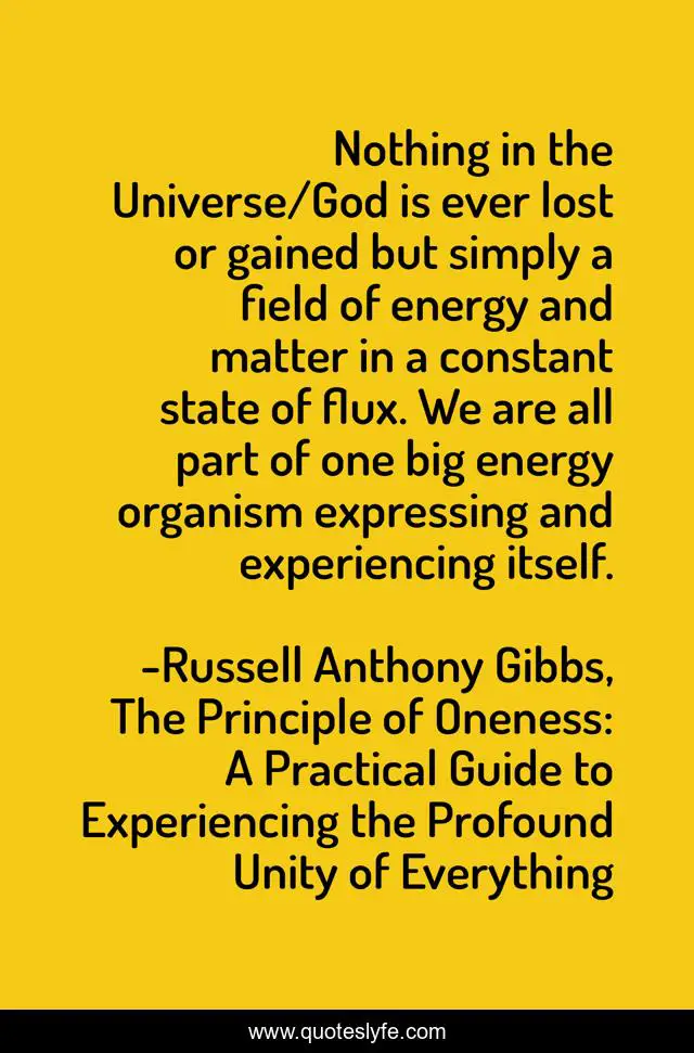 This page presents the quote "Nothing in the Universe/God is ever lost or gained but simply a field of energy and matter in a constant state of flux. We are all part of one big energy organism expressing and experiencing itself.". Author of this quote is Russell Anthony Gibbs, The Principle of Oneness: A Practical Guide to Experiencing the Profound Unity of Everything. This quote is about god, energy, matter, oneness, universe,.