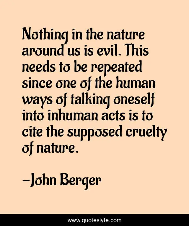 This page presents the quote "Nothing in the nature around us is evil. This needs to be repeated since one of the human ways of talking oneself into inhuman acts is to cite the supposed cruelty of nature.". Author of this quote is John Berger. This quote is about nothing, evil, human,.