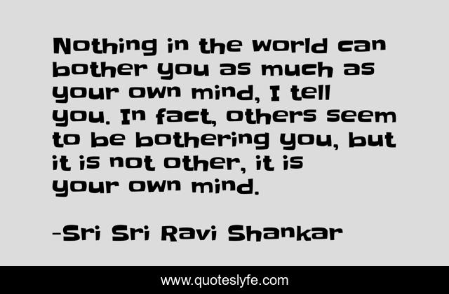 This page presents the quote "Nothing in the world can bother you as much as your own mind, I tell you. In fact, others seem to be bothering you, but it is not other, it is your own mind.". Author of this quote is Sri Sri Ravi Shankar. This quote is about mind, problems, inspirational, enthusiasm,.