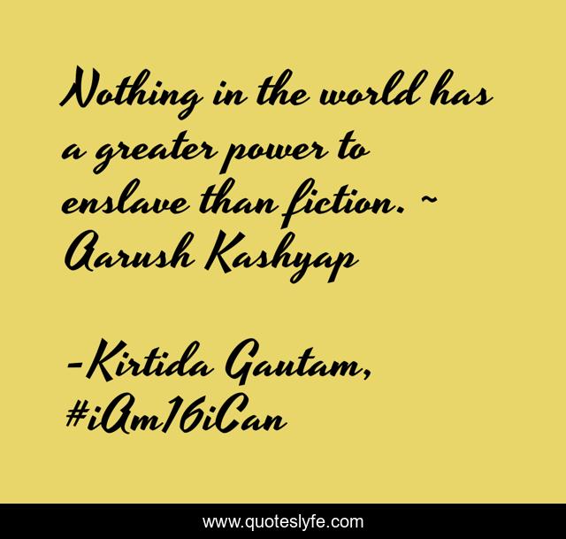 This page presents the quote "Nothing in the world has a greater power to enslave than fiction. ~ Aarush Kashyap". Author of this quote is Kirtida Gautam, #iAm16iCan. This quote is about fiction, aarush-kashyap, teenager, thriller, psychology,.