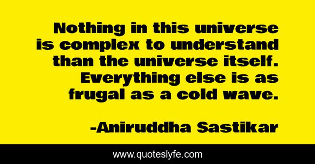 This page presents the quote "Nothing in this universe is complex to understand than the universe itself. Everything else is as frugal as a cold wave.". Author of this quote is Aniruddha Sastikar. This quote is about struggles-in-relationships, relationship, universe, frugal, complex, realization,.