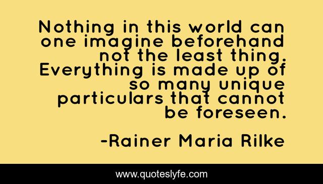 This page presents the quote "Nothing in this world can one imagine beforehand not the least thing. Everything is made up of so many unique particulars that cannot be foreseen.". Author of this quote is Rainer Maria Rilke. .