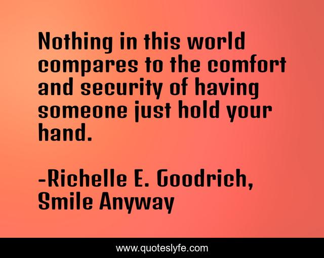 This page presents the quote "Nothing in this world compares to the comfort and security of having someone just hold your hand.". Author of this quote is Richelle E. Goodrich, Smile Anyway. This quote is about life, trials, grief, holding-hands, difficulties, richelle, comofirt, richelle-goodrich, security,.