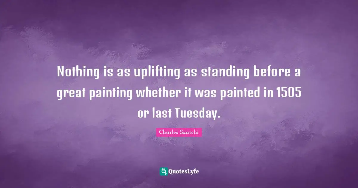 This page presents the quote "Nothing is as uplifting as standing before a great painting whether it was painted in 1505 or last Tuesday.". Author of this quote is Charles Saatchi. This quote is about uplifting, standing, greatness, painting, tuesday,.