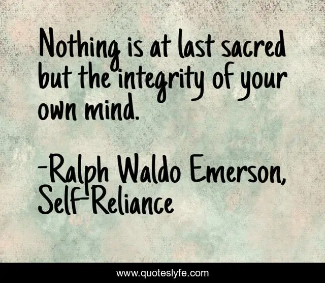 This page presents the quote "Nothing is at last sacred but the integrity of your own mind.". Author of this quote is Ralph Waldo Emerson, Self-Reliance. This quote is about integrity, mind,.