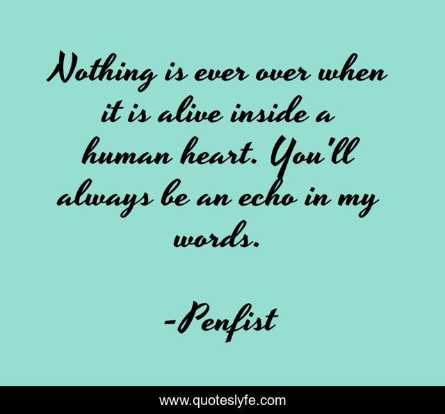 This page presents the quote "Nothing is ever over when it is alive inside a human heart. You'll always be an echo in my words.". Author of this quote is Penfist. This quote is about echo, words, never-over,.