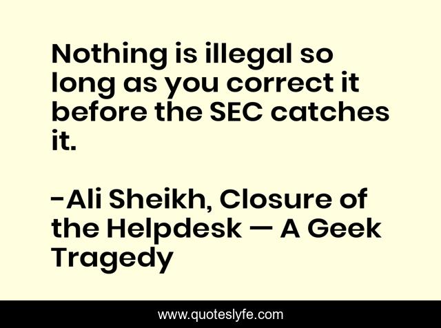 This page presents the quote "Nothing is illegal so long as you correct it before the SEC catches it.". Author of this quote is Ali Sheikh, Closure of the Helpdesk — A Geek Tragedy. This quote is about law, sec, business, economy,.