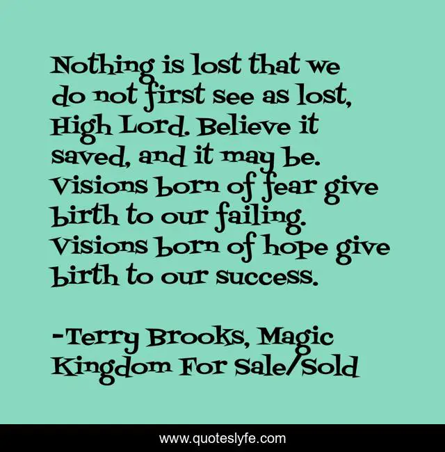 This page presents the quote "Nothing is lost that we do not first see as lost, High Lord. Believe it saved, and it may be. Visions born of fear give birth to our failing. Visions born of hope give birth to our success.". Author of this quote is Terry Brooks, Magic Kingdom For Sale/Sold. .