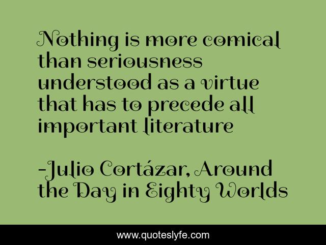 This page presents the quote "Nothing is more comical than seriousness understood as a virtue that has to precede all important literature". Author of this quote is Julio Cortázar, Around the Day in Eighty Worlds. This quote is about serious, literature, writing,.