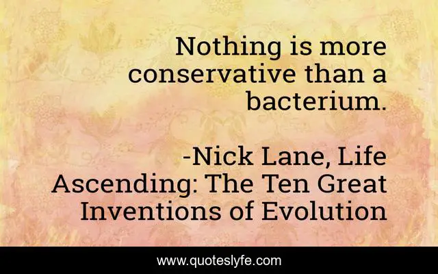 This page presents the quote "Nothing is more conservative than a bacterium.". Author of this quote is Nick Lane, Life Ascending: The Ten Great Inventions of Evolution. This quote is about evolution, life, bacteria,.