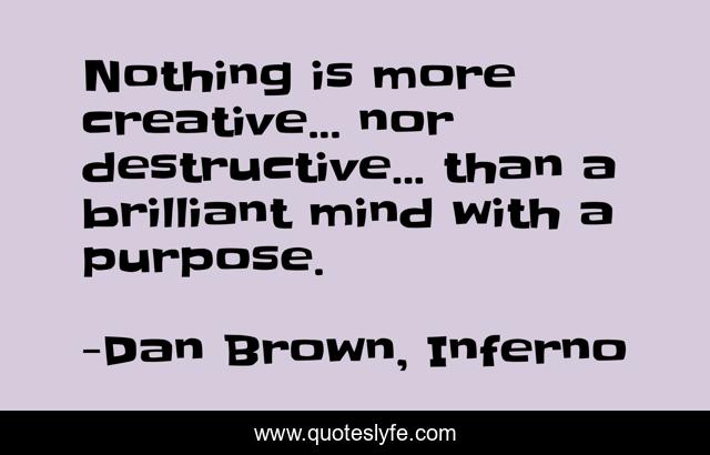 This page presents the quote "Nothing is more creative... nor destructive... than a brilliant mind with a purpose.". Author of this quote is Dan Brown, Inferno. This quote is about brilliant, purpose,.