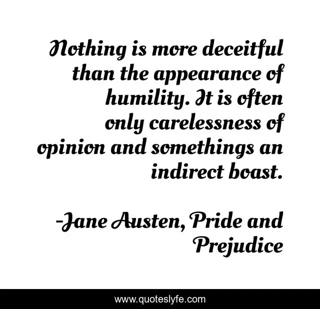This page presents the quote "Nothing is more deceitful than the appearance of humility. It is often only carelessness of opinion and somethings an indirect boast.". Author of this quote is Jane Austen, Pride and Prejudice. This quote is about deceit, carelessness-of-opinion, indirect-boast, humility, pride-and-prejudice,.