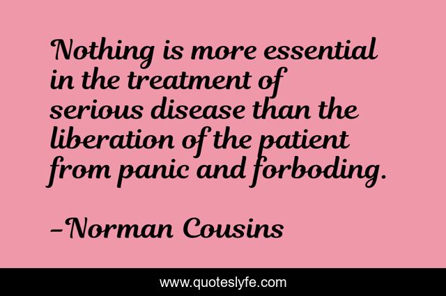 This page presents the quote "Nothing is more essential in the treatment of serious disease than the liberation of the patient from panic and forboding.". Author of this quote is Norman Cousins. This quote is about medicine, sickness,.