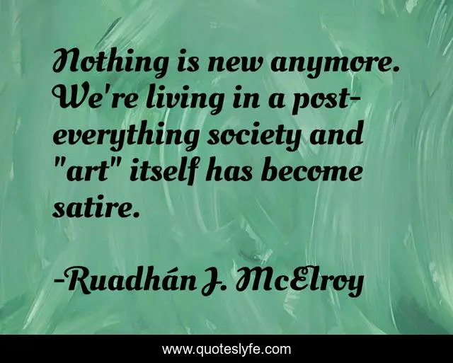 This page presents the quote "Nothing is new anymore. We're living in a post-everything society and "art" itself has become satire.". Author of this quote is Ruadhán J. McElroy. This quote is about society, art,.