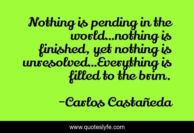 This page presents the quote "Nothing is pending in the world…nothing is finished, yet nothing is unresolved…Everything is filled to the brim.". Author of this quote is Carlos Castañeda. This quote is about carlos-castaneda, reality,.