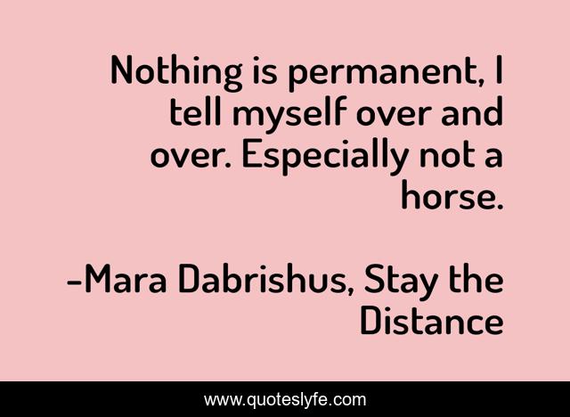 This page presents the quote "Nothing is permanent, I tell myself over and over. Especially not a horse.". Author of this quote is Mara Dabrishus, Stay the Distance. This quote is about horses, young-adult, horse-racing,.