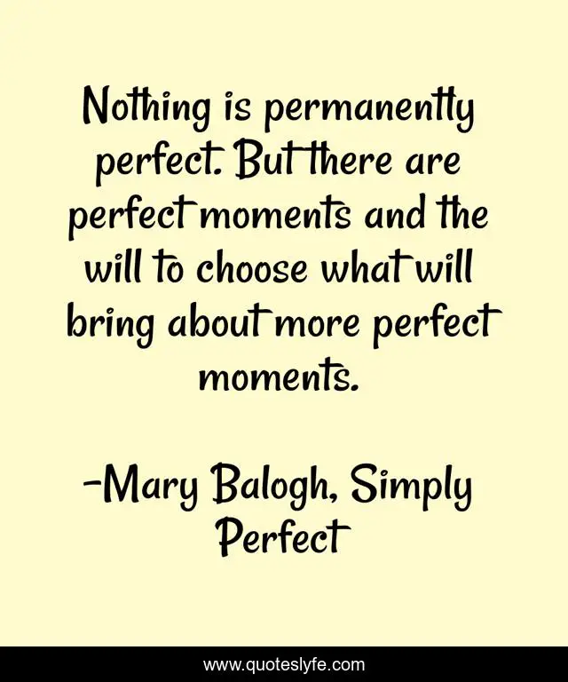 This page presents the quote "Nothing is permanently perfect. But there are perfect moments and the will to choose what will bring about more perfect moments.". Author of this quote is Mary Balogh, Simply Perfect. This quote is about moments, perfect, choice,.