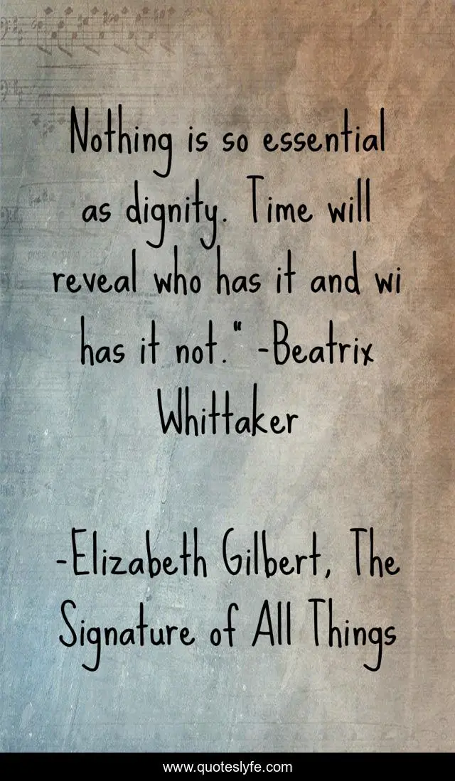 This page presents the quote "Nothing is so essential as dignity. Time will reveal who has it and wi has it not." -Beatrix Whittaker". Author of this quote is Elizabeth Gilbert, The Signature of All Things. This quote is about dignity, respect,.