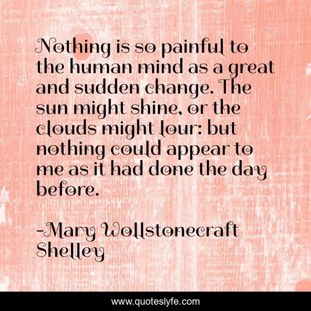 This page presents the quote "Nothing is so painful to the human mind as a great and sudden change. The sun might shine, or the clouds might lour: but nothing could appear to me as it had done the day before.". Author of this quote is Mary Wollstonecraft Shelley. .