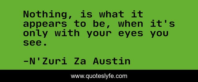 This page presents the quote "Nothing, is what it appears to be, when it's only with your eyes you see.". Author of this quote is N'Zuri Za Austin. This quote is about seeing, appearance, vision, future, journey-of-life, journey, inspiration,.