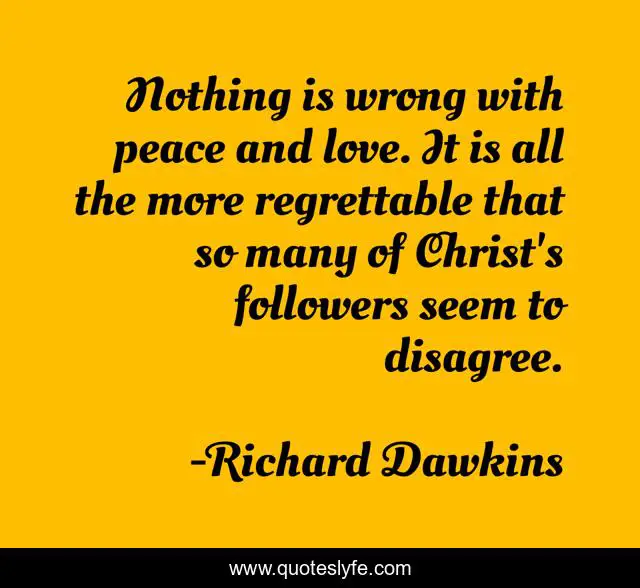 This page presents the quote "Nothing is wrong with peace and love. It is all the more regrettable that so many of Christ's followers seem to disagree.". Author of this quote is Richard Dawkins. This quote is about love, peace and love, affection,.