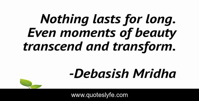This page presents the quote "Nothing lasts for long. Even moments of beauty transcend and transform.". Author of this quote is Debasish Mridha. This quote is about philosophy, beauty, mridha, debasish, debasish-mridha, inspirational, enthusiasm, nothing-lasts-for-long, transcend-and-transform,.