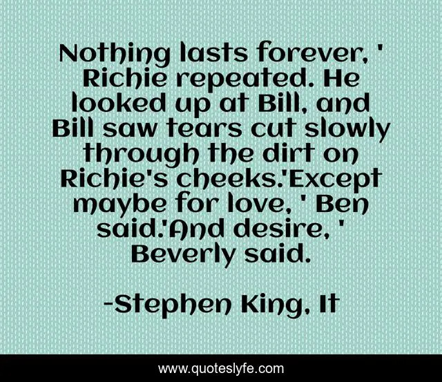 Nothing lasts forever, ' Richie repeated. He looked up at Bill, and Bill saw tears cut slowly through the dirt on Richie's cheeks.'Except maybe for love, ' Ben said.'And desire, ' Beverly said.