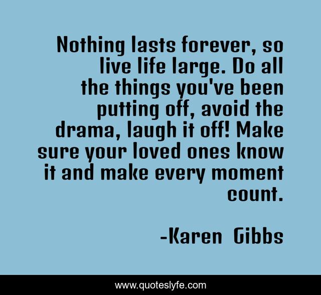 This page presents the quote "Nothing lasts forever, so live life large. Do all the things you've been putting off, avoid the drama, laugh it off! Make sure your loved ones know it and make every moment count.". Author of this quote is Karen Gibbs. This quote is about confidence, positive, motivational, optimistic, inspirational, enthusiasm, live-in-the-moment,.