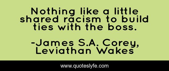 This page presents the quote "Nothing like a little shared racism to build ties with the boss.". Author of this quote is James S.A. Corey, Leviathan Wakes. This quote is about in-group-out-group, sarcasm,.