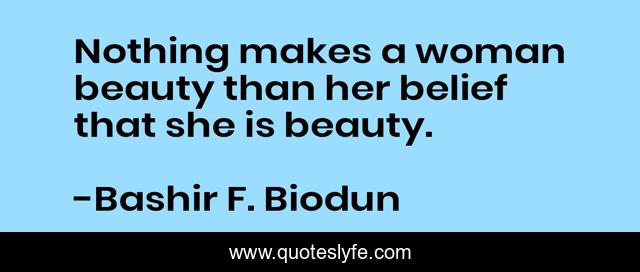 This page presents the quote "Nothing makes a woman beauty than her belief that she is beauty.". Author of this quote is Bashir F. Biodun. .