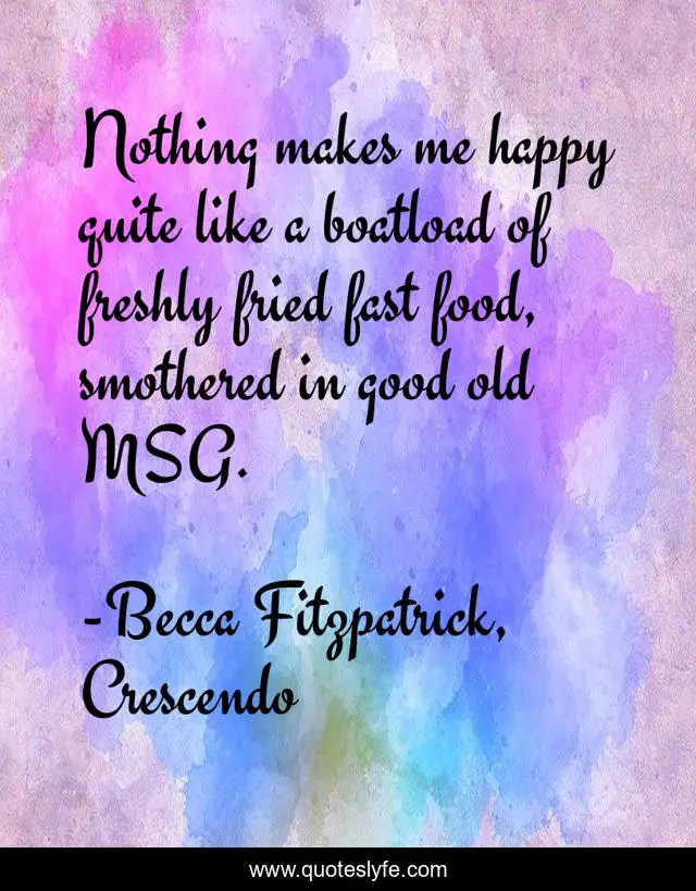 This page presents the quote "Nothing makes me happy quite like a boatload of freshly fried fast food, smothered in good old MSG.". Author of this quote is Becca Fitzpatrick, Crescendo. This quote is about crescendo, hush-hush, becca-fitzpatrick, quote,.