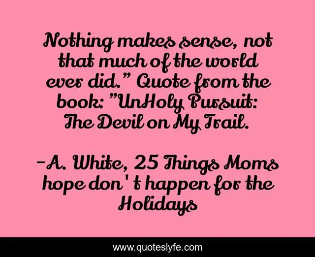 This page presents the quote "Nothing makes sense, not that much of the world ever did." Quote from the book: "UnHoly Pursuit: The Devil on My Trail.". Author of this quote is A. White, 25 Things Moms hope don't happen for the Holidays. This quote is about life, love, family, humor, marriage, inspirational, enthusiasm, affection,.