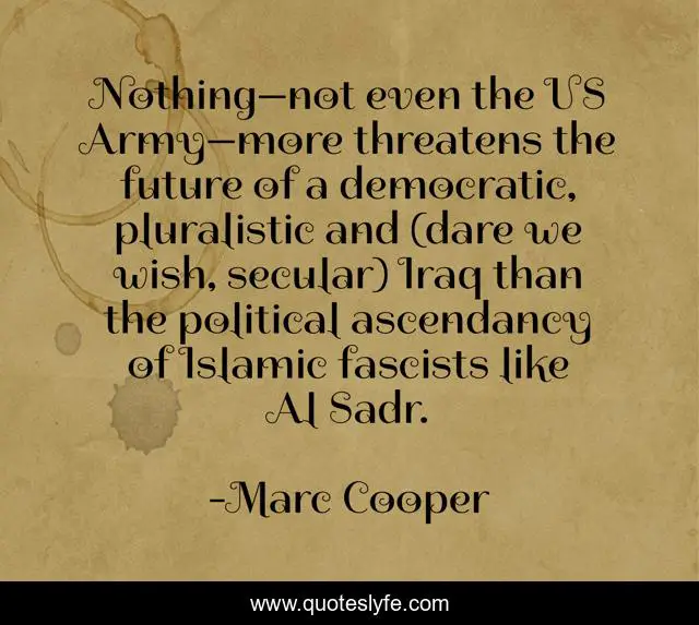 This page presents the quote "Nothing—not even the US Army—more threatens the future of a democratic, pluralistic and (dare we wish, secular) Iraq than the political ascendancy of Islamic fascists like Al Sadr.". Author of this quote is Marc Cooper. This quote is about mahdi-army, united-states-army, democracy, iraq-war, fascism, secularism, muqtada-al-sadr, united-states, pluralism,.