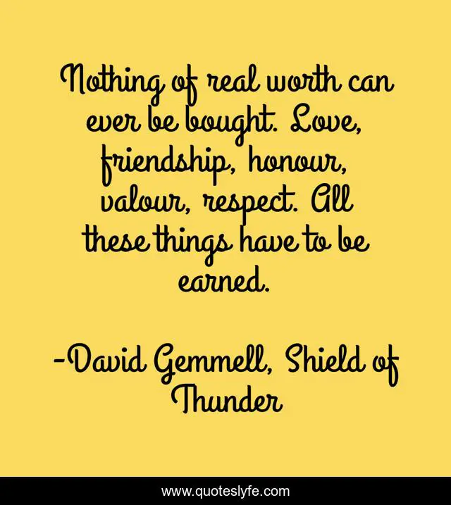 This page presents the quote "Nothing of real worth can ever be bought. Love, friendship, honour, valour, respect. All these things have to be earned.". Author of this quote is David Gemmell, Shield of Thunder. This quote is about love, honour, valour, respect, friendship, affection,.
