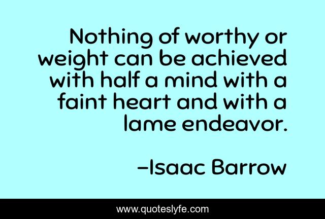 This page presents the quote "Nothing of worthy or weight can be achieved with half a mind with a faint heart and with a lame endeavor.". Author of this quote is Isaac Barrow. This quote is about commitment, belief,.