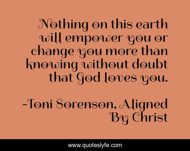 This page presents the quote "Nothing on this earth will empower you or change you more than knowing without doubt that God loves you.". Author of this quote is Toni Sorenson, Aligned By Christ. This quote is about empowerment, love, god, life, affection, change, inspiration,.