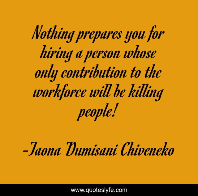 This page presents the quote "Nothing prepares you for hiring a person whose only contribution to the workforce will be killing people!". Author of this quote is Taona Dumisani Chiveneko. This quote is about african, paranormal, suspense-thriller, mystrey,.